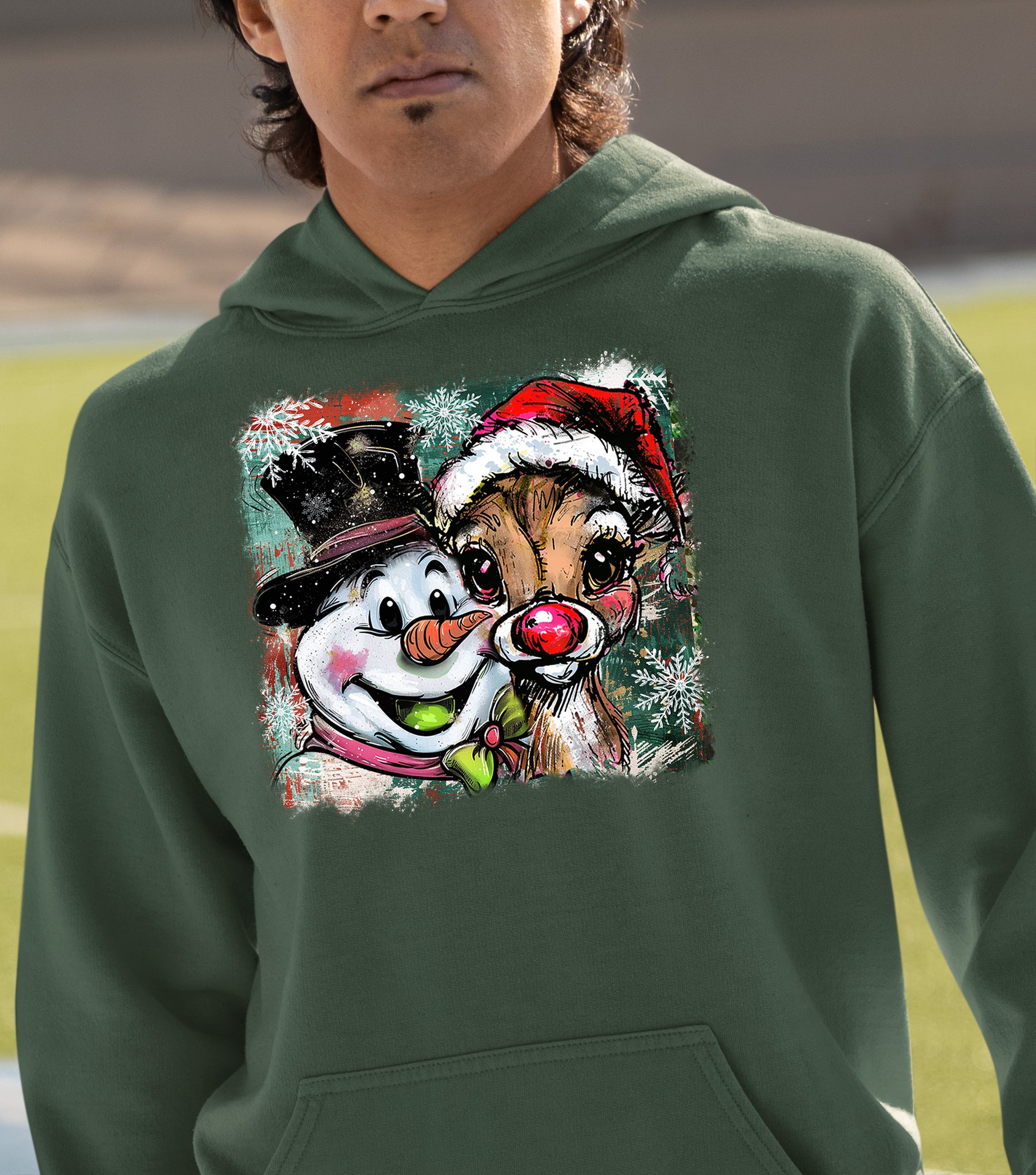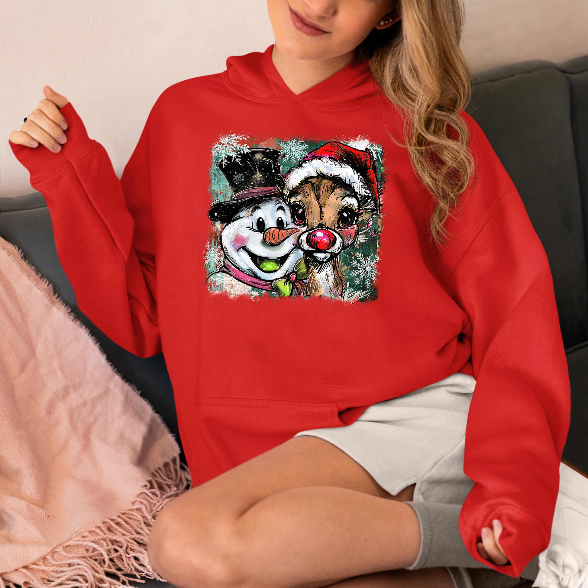 Christmas Raindeer with Snowman Scene, Cozy Winter Holiday Craft, Handmade Seasonal Gift Idea Hoodie
